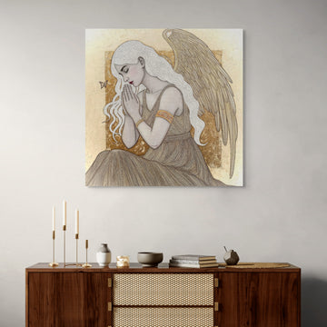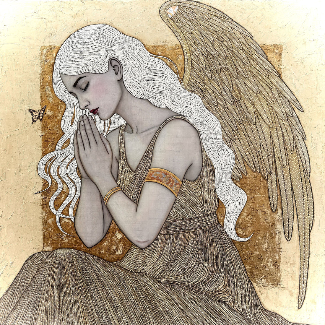 "For Natalie, each figure emerges through a quiet unfolding, the curve of a shoulder, the hush of closed eyes, held within layered surfaces rich with texture and depth. Gold elements appear as subtle markers of the sacred, suggesting moments of illumination, protection, and inner knowing. These works reflect a gentle strength, where softness and resilience exist together, and presence is felt in stillness"