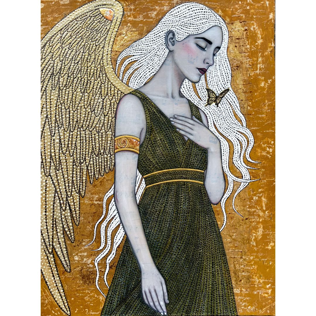 "For Natalie, each portrait is a quiet unfolding — the curve of a shoulder, the hush of closed eyes — set against layered surfaces rich with texture and meaning. Gold halos echo the Enso circle of enlightenment, while paper cranes nod to ancient wishes for healing and hope. These women are resilience made visible, where softness meets grit and strength blooms in silence."