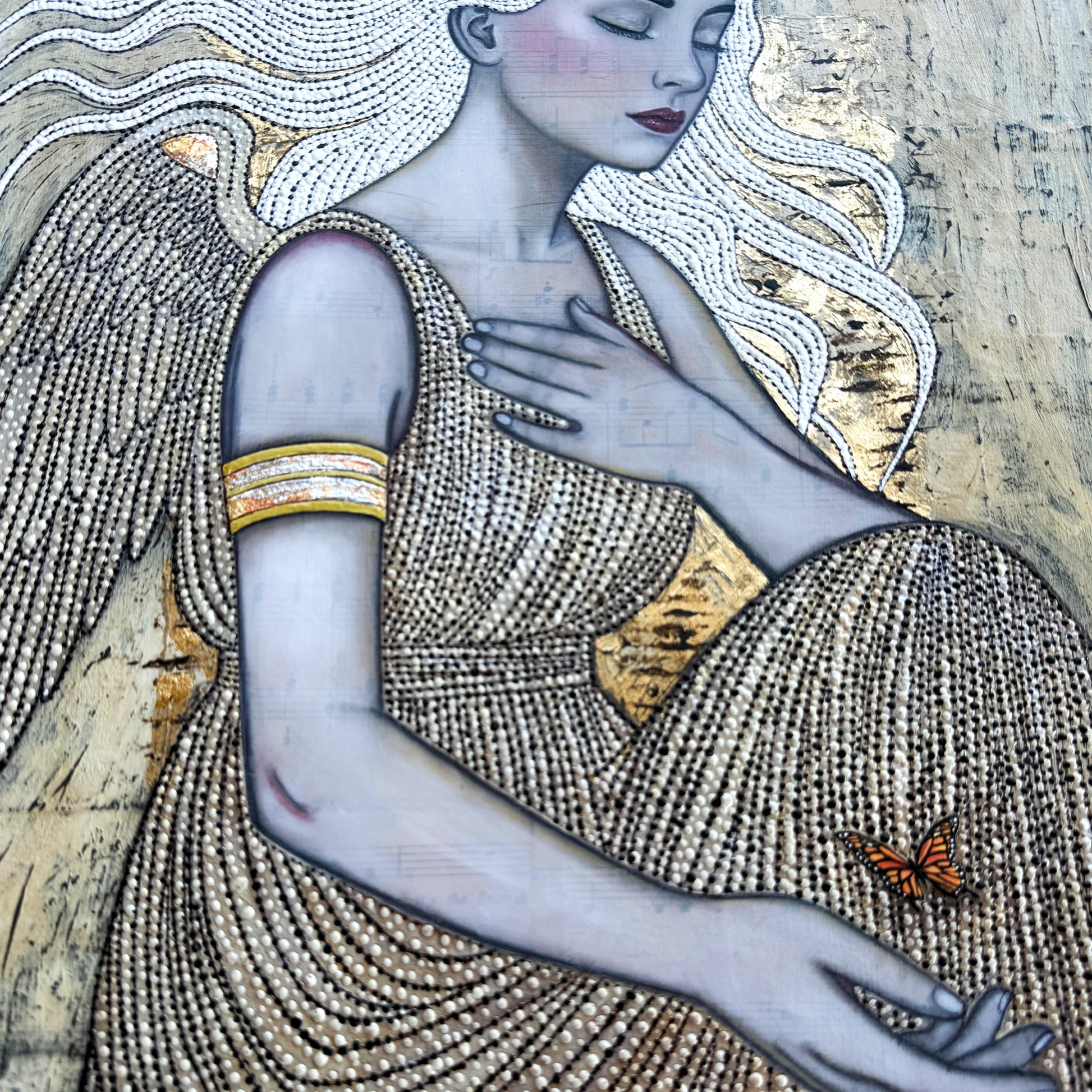 Gold elements appear throughout the works — not as decoration, but as quiet markers of the sacred. Subtle halos, panels, and accents reference illumination, protection, and inner knowing. They evoke the idea of a passage or doorway, hinting at what lies just beyond the visible — the light that exists between worlds.