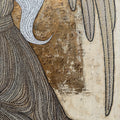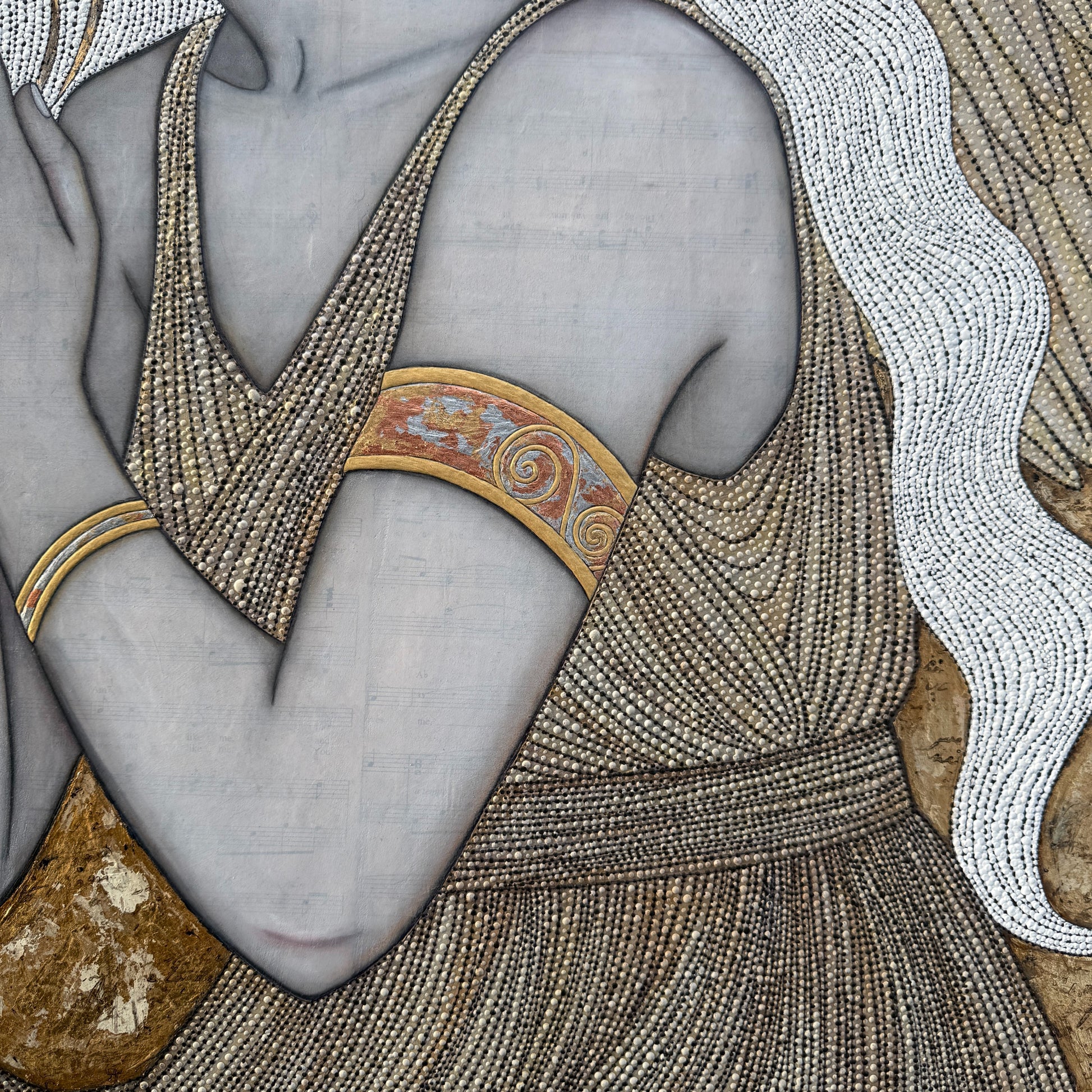 Gold elements appear not as decoration, but as quiet markers of the sacred. The panel behind the figure suggests a threshold, a space of passage, illumination, and inner knowing. It holds the figure gently, like a doorway between what has been and what is becoming.