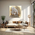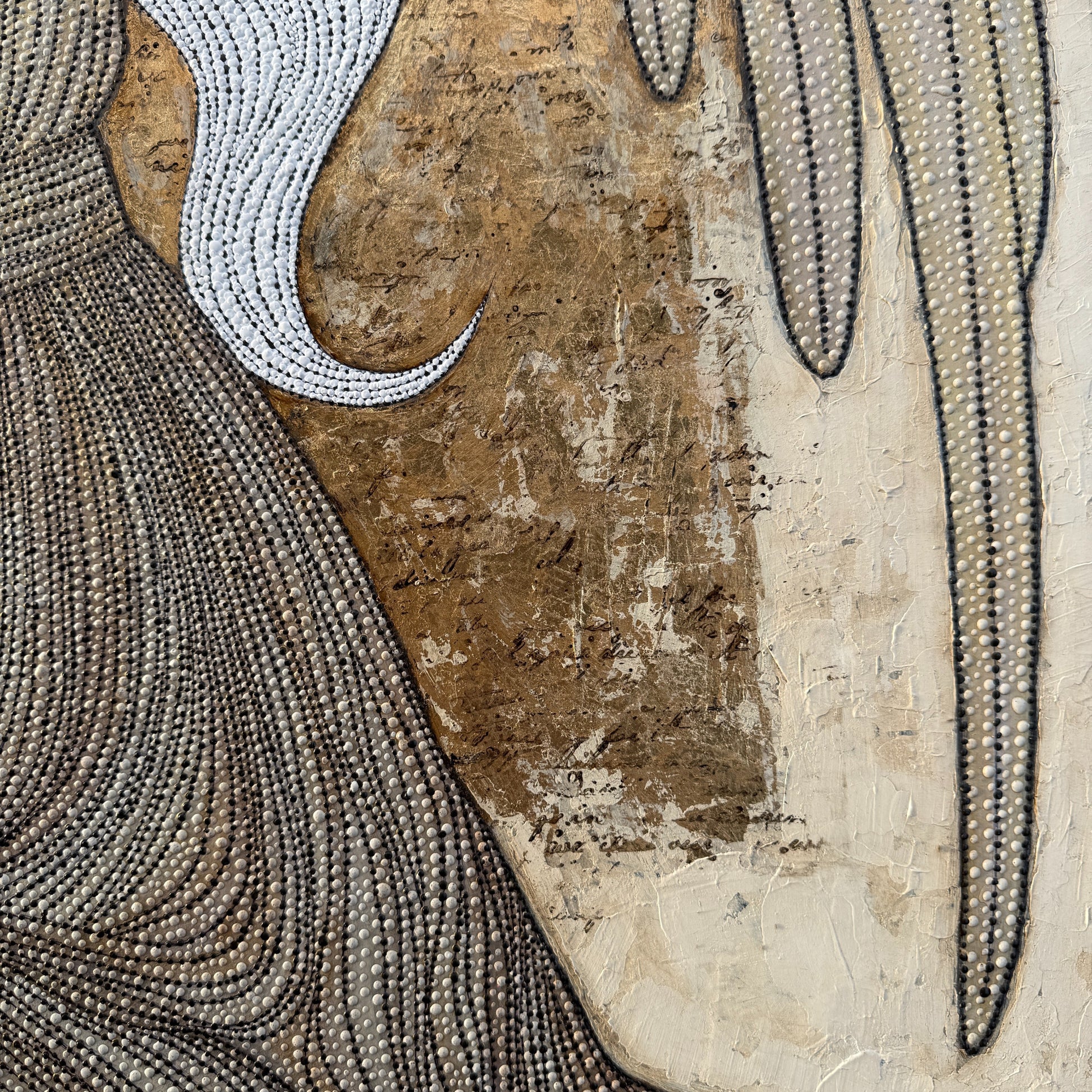 The palette is deliberately restrained, with warm parchment tones, muted ivories, and soft metallics, allowing space for reflection. Subtle glazes create depth and luminosity, inviting the viewer to slow down and engage on an emotional level.
