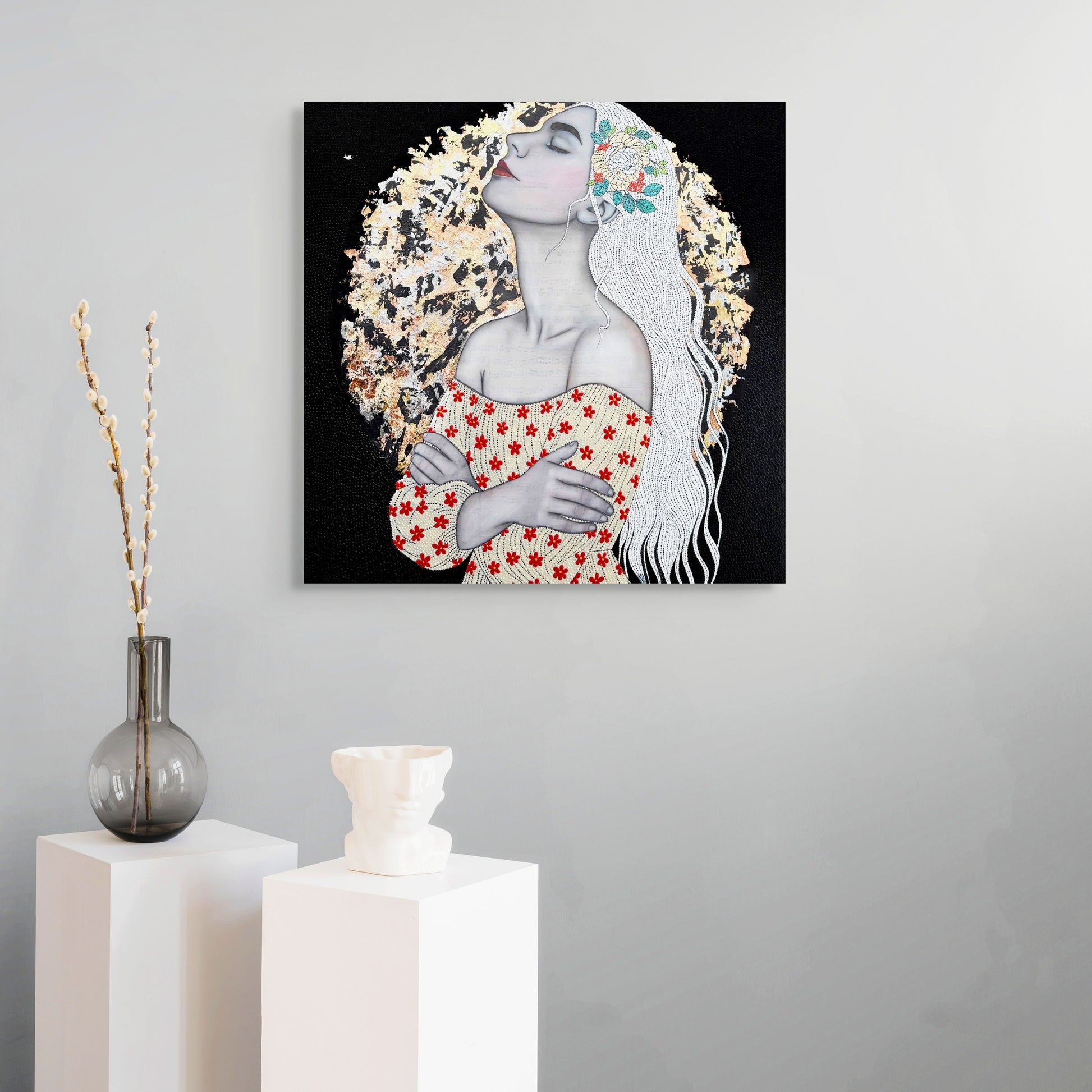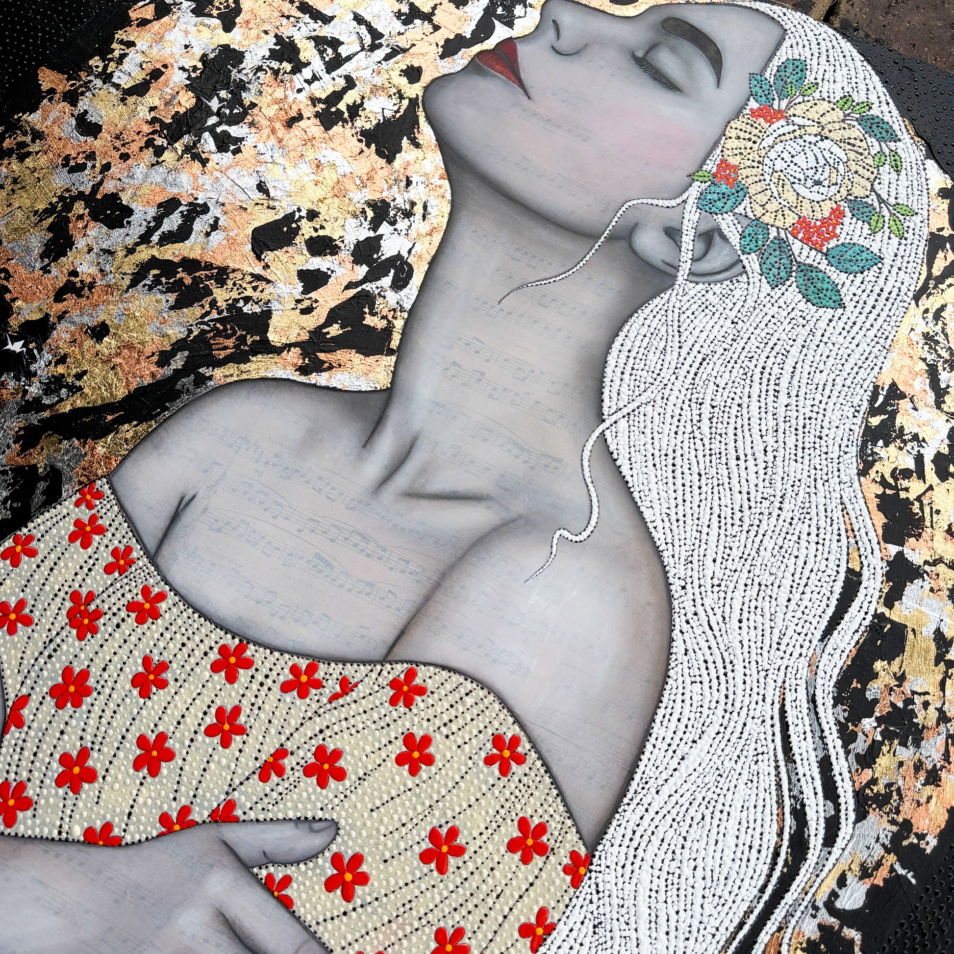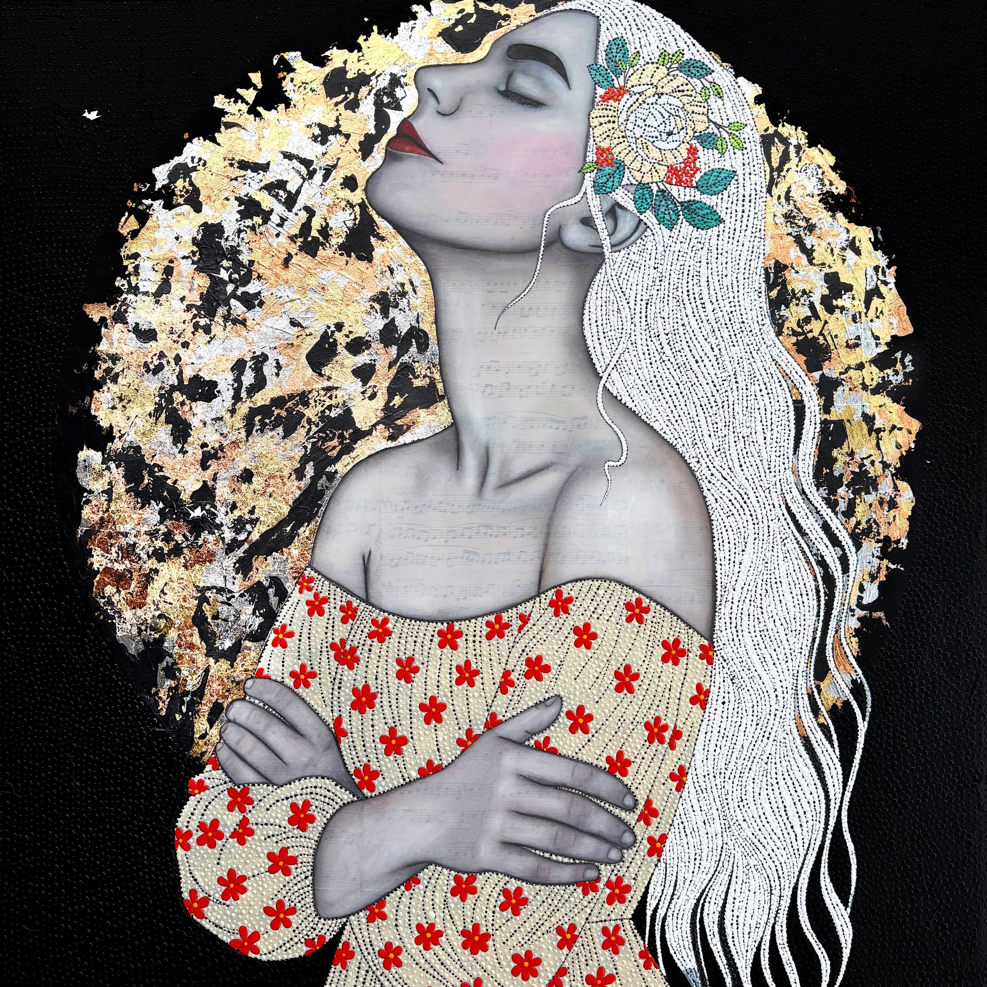 In response to the complexities of recent years, Natalie’s latest series offers a visual meditation on renewal. Each painting portrays serene, contemplative women with flowing white hair, embodying the winds of change and the passage of time. Intertwined among them are delicate paper cranes, signifying new beginnings, wishes fulfilled, and the quiet hope that carries us forward.
