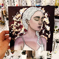 In response to the complexities of recent years, Natalie’s latest series offers a visual meditation on renewal. Each painting portrays serene, contemplative women with flowing white hair, embodying the winds of change and the passage of time. Intertwined among them are delicate paper cranes, signifying new beginnings, wishes fulfilled, and the quiet hope that carries us forward.